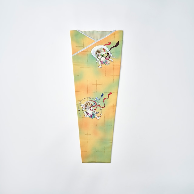 提琴衣(ていきんえ) 正絹の着物生地で仕立てた一点もののヴァイオリン保護袋(Violin Cover / Violin Bag) 作品名:風神雷神 意匠制作:木下秀硯 氏作 サイズ 口幅 30cm 底幅 17cm 長さ 76cm 販売価格 275,000円(税込) (提琴)ヴァイオリンに、(衣)きものを纏わせる 提琴衣は、日本の衣文化である「きもの」から着想を得て制作されたヴァイオリン保護カバーです。 京都の伝統工芸の技術をもとに、職人方の手仕事によって作り出される一点ものです。 生地には正絹(絹100%)の着物生地を使用。正絹は吸湿・放湿に優れ、湿度変化に弱いヴァイオリンの保管にとても適した素材です。 そして縫製は、熟練和裁士監修によるきものの仕立て技術を応用した完全手縫い仕立てで、楽器をやさしく包み込みます。 意匠は本作のために、木下秀硯氏がろうけつ染めの技術を用いて手描きで制作した一点ものです。 描かれているのは、日本の神話に伝わる風神雷神の姿です。 それぞれ躍動感のある姿で、風神は風袋(ふうたい)、雷神は連太鼓(れんだいこ)を背負い、ユーモラスな鬼の姿で描かれています。 古くから災厄を払い、福を呼ぶ吉祥の意匠として受け継がれてきました。 提琴衣は、高品質なヴァイオリンカバーとしての実用性、そして同時に、素材、職人の工程・技術、作品性が重なり形づくられる一点の工芸作品です。 ご自身の大切なヴァイオリンに。 またヴァイオリンを大切になさっている方への贈り物や、お祝いの品にもお喜びいただいています。 提琴衣は、長く安心してご愛用いただけるよう、内側生地の張り替えサービスにもご対応しております。 大切なヴァイオリンに長く寄り添い守る一品となっております。 English keywords violin cover / silk violin bag / kimono violin cover / Kyoto artisan