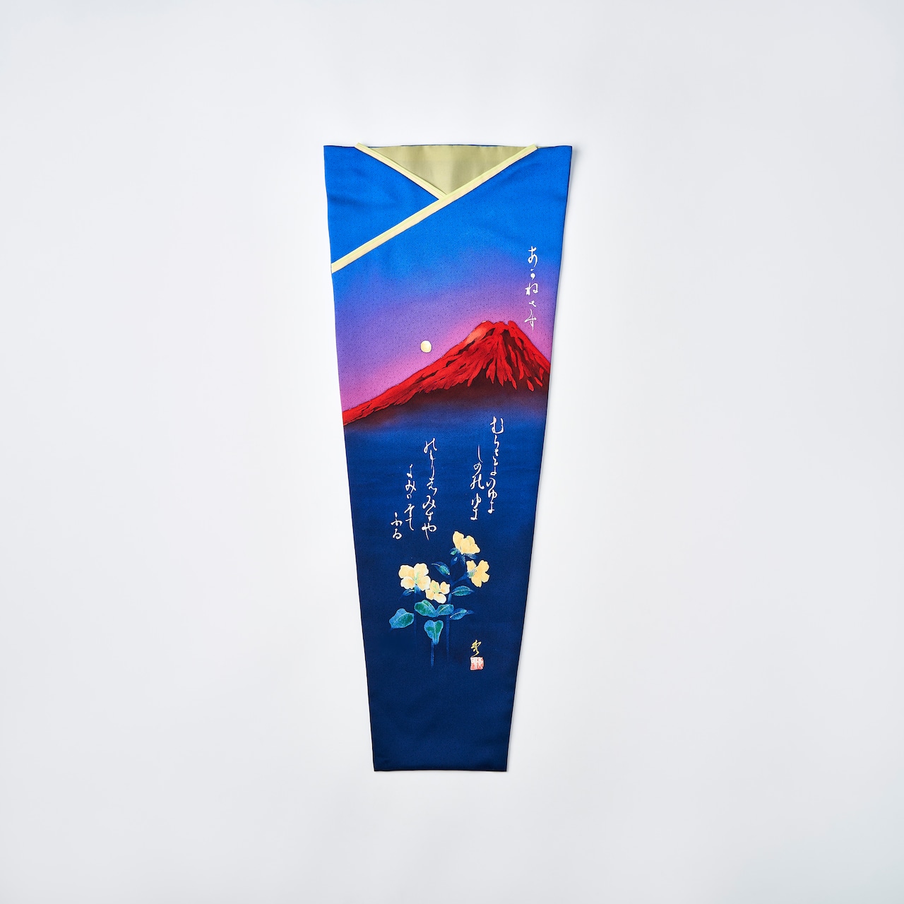 描かれているのは赤富士、日本を象徴する霊峰富士の姿を題材とした意匠です。夜明けの光に染まる富士の情景とともに、和歌が添えられています。 古くから伝わる和歌の情景とともに、日本の自然と文化の趣を感じられる作品です。